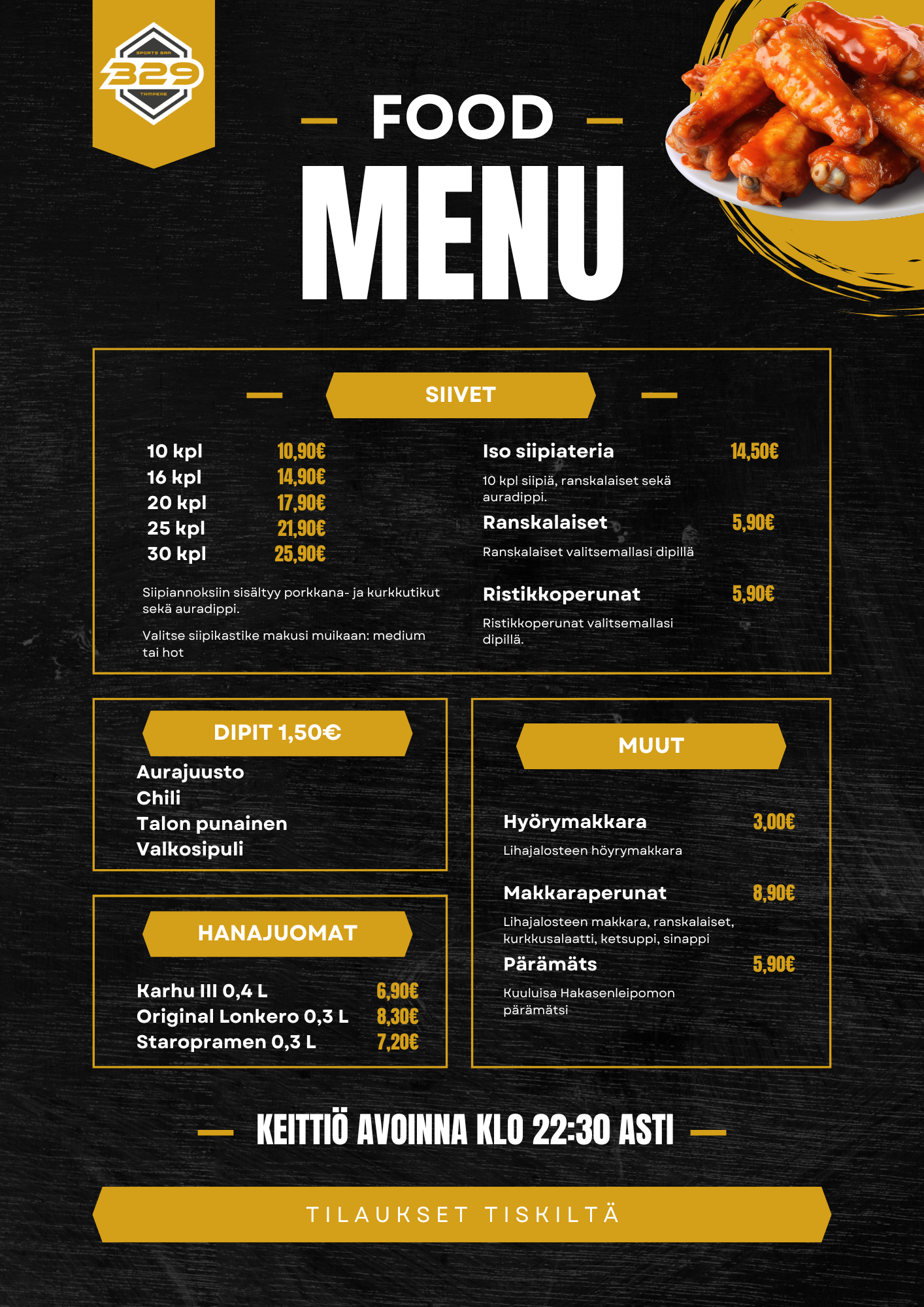 Sports Bar 329 on enemmän kuin pelkkä baari – se on paikka, jossa urheilu ja rento tunnelma kohtaavat. Tarjolla on laaja olut valikoima joka kruunaa jokaisen peli-illan.